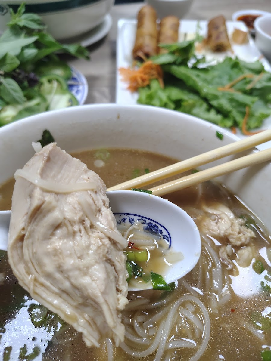 Delish, the Pho Ga has giant chunks of chicken meat, which is great. There's no chicken tendon, rooster cock, or face, just whole meat.